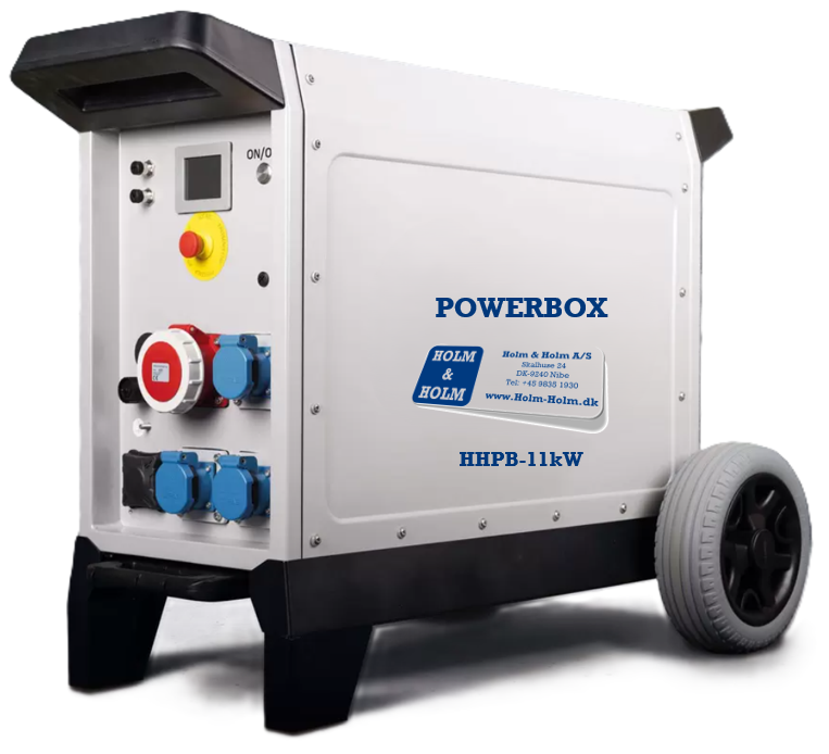 Mobil Powerbox med kapacitet på 8,9 kWh og 11 kW kontinuerlig effekt, inkl. tilslutninger til 230V / 400V forbrugere 2x CEE 16/3-stik 1x CEE 16/5-stik 1X Paralellstik Opladningseffekt maks. 4,4 kW Opladningstid: 5 timer i husholdningsnetværk (230V) Option: 2 timer med mulighed for hurtigopladning i trefaset netværk (400V) Med følgende tilbehør: *230V Lader *400V Lader