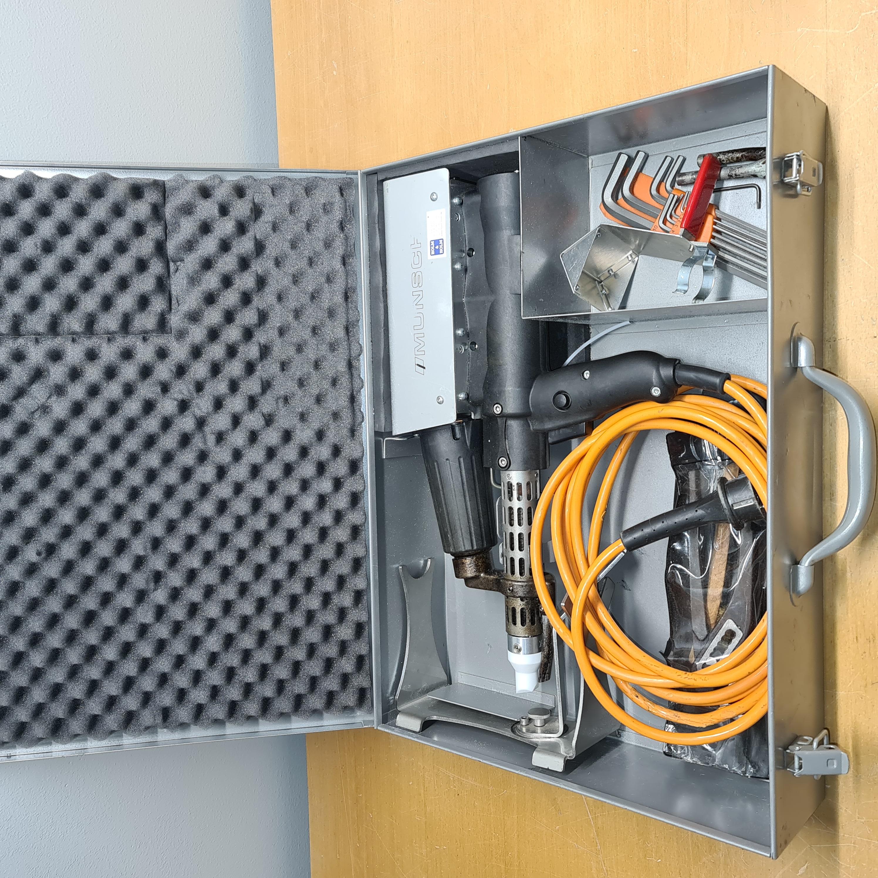 Munsch Mini bliver  leveret med stander, forvarmeskærm,  Der medfølger praktisk kuffert med rumopdeling , hvilket gør det meget nemt at anvende ekstruderen på rejsearbejde og lignende.