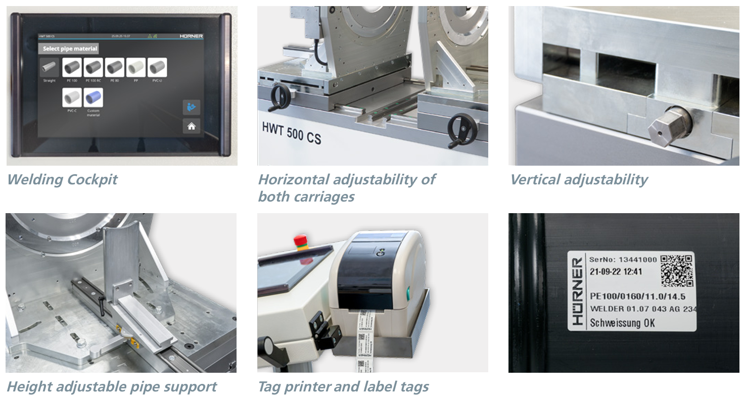 Den servo-opererede værkstedsmaskine HÜRNER HWT 500 CS er designet til fremstilling af rør, segmentbøjninger og fittings i PE, PE 100 RC, PP samt PVC-U og PVC-C. Den er udstyret med smalle aluminiumshovedklemmer og kan bearbejde rør og segmenter op til en udvendig diameter på 500 mm / 20" med enhver SDR-ratio op til SDR 9.